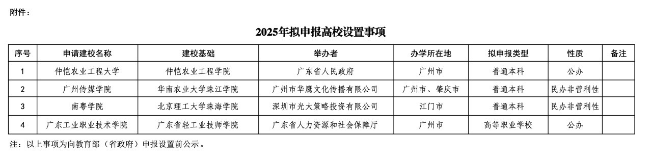 10月10日,据广东省教育厅公示,广东4所高校拟更名转设,仲恺农业工程学院拟更名为仲恺农业工程大学,华南农业大学珠江学院拟转设为广州传媒学院,北京理工大学珠海学院拟转设为南粤学院,拟以广东省轻工业技师学院为基础设立广东工业职业技术学院。详情>>